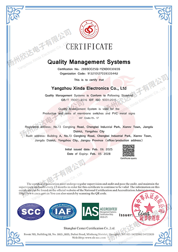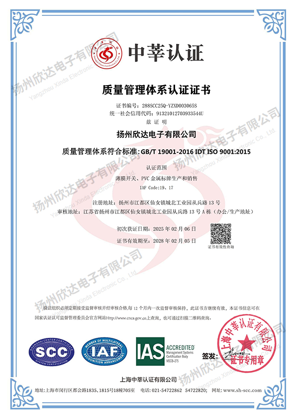 揚(yáng)州欣達(dá)電子有限公司是一家從事電子輕觸薄膜開(kāi)關(guān),薄膜面板及PVC、金屬標(biāo)牌,不干膠貼,噴塑、烤漆絲印面板等各種絲印工藝的有限責(zé)任公司。公司位于風(fēng)景秀麗的文化名城江蘇揚(yáng)州市江都區(qū)。自1993年建廠(chǎng)以來(lái),我們致力于信譽(yù)至上,顧客為首的原則,及時(shí)為廣大客戶(hù)提供合格滿(mǎn)意的產(chǎn)品:堅(jiān)持著質(zhì)量為首,持續(xù)改進(jìn)的方針,狠抓品質(zhì)管理,取得了客戶(hù)的認(rèn)可:履行著誠(chéng)信、互惠的宗旨,贏得了客戶(hù)的支持和信任。目前公司擁有先進(jìn)的絲網(wǎng)印刷設(shè)備,熟練的業(yè)務(wù)技術(shù)骨干和嶄新適用的廠(chǎng)房,每年為全國(guó)各地的客戶(hù)提供數(shù)億的合格產(chǎn)品。我們把“誠(chéng)信、務(wù)實(shí)、求精、創(chuàng)新”作為我們的企業(yè)宗旨,在經(jīng)營(yíng)管理中貫徹“以人為本,精益求精”的經(jīng)營(yíng)理念;在生產(chǎn)管理中嚴(yán)格按ISO9001質(zhì)量體系落實(shí)生產(chǎn); 在為客戶(hù)服務(wù)過(guò)程中按照產(chǎn)品的分類(lèi)提供多種設(shè)計(jì)方案,讓我們產(chǎn)品更好體現(xiàn)客戶(hù)的理念。...